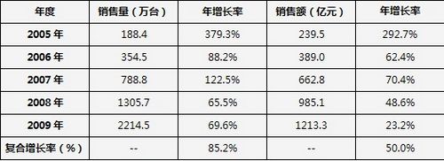 2010年4月13日,中國權威ICT研究與管理咨詢機構賽迪顧問股份有限公司(股票代碼:HK8235)在“2010中國消費電子市場年會”上發布《2009-2010年中國平板電視市場研究年度報告》顯示:2009年,中國電視市場上,LCD電視已經完成了對CRT電視的取代,LCD電視憑借產品性能的不斷升級和價格的不斷降低,在中國平板電視市場上占據主要地位,PDP依然在大尺寸平板電視市場固守陣地,但其市場份額被LCD不斷蠶食的局面已經顯現。據賽迪顧問統計顯示,2009年中國市場共銷售平板電視2214.5萬臺,同比增長了69.6%,實現銷售收入1213.3億元人民幣,同比增長了23.2%。2005年-2009年中國平板電視銷售量復合增長率高達85.2%。