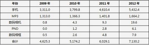 表3 2010-2012年中國主要消費電子產品應用OLED面板出貨量預測