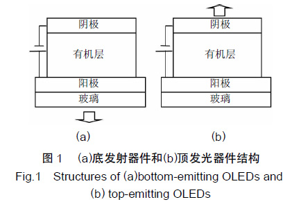 有機電致發光器件(OLEDs)以其亮度高、視角寬、功耗小、響應快和成本低等優點引起全球范圍內的研究熱潮[1],被業界公認為是取代液晶顯示器的新一代顯示技術。按光從器件出射方向的不同,OLEDs 主要分為兩種不同的結構:一種是底發射器件(圖1(a)),另一種頂發射器件(圖1(b))。有源驅動有機發光器件(AM-OLED) 是未來制備大尺寸、高清晰度有機顯示設備的研發重點之一,它要求OLEDs 器件要與薄膜晶體管(TFT)配合使用。這樣一來,從底發射器件中發出的光只能部分地從驅動面板上設置的開口處射出,大部分發光都被浪費,開口率較低,僅為30%~ 50%。而且隨著清晰度的提高,開口率還會降低,一般來說,對于圖像分辨率大于300 ppi 的顯示設備開口率會降到10%以下[2]。而在頂發射器件中,光從器件的頂部出射則不受TFT 的影響,因此能有效提高開口率,理論上可達100%[3],有利于器件與電路的集成。而且頂發射器件還具有提高器件效率、窄化光譜和提高色純度等優點[4-7]。彩色顯示是衡量顯示器是否在市場上具有競爭力的重要標志。OLEDs 實現彩色化通常有下面三種方法:紅綠藍(RGB)像素獨立發光,白光器件結合彩色濾光片和光色轉換。其中,白光器件結合彩色濾光片的方法是業內公認的實現全彩色顯示最簡單的方法,能有效解決RGB像素金屬蔭罩對位精度的問題。