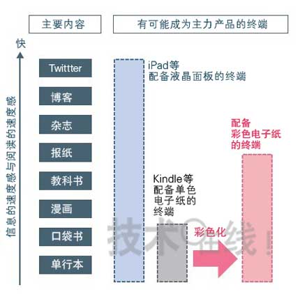 電子紙的彩色化趨勢不斷加速。但是,其前進道路上充滿了荊棘。因為隨著蘋果公司的“iPad”上市,電子紙不得不與擅長彩色表現力的液晶面板進行對比。市場評價將嚴重左右電子紙今后的發展。
