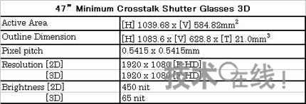 該表并非47英寸液晶電視的性能指標,而是IPS液晶面板的相關數據。由于有解說員在場,因此筆者向其詢問“Brightness(亮度)是如何測定的”,得到的回答卻是“不清楚”。看來要想進一步打聽快門眼鏡(Shutter Glass)的構造和原理,以及單眼觀看時的體感亮度等技術的話會更因難。不過,既然該面板打出了“Minimum Crosstalk”的招牌,作為核心要素的串擾率又為何沒有任何記載呢?看著LG電子的展板,筆者的心頭又涌起了這樣的疑問。