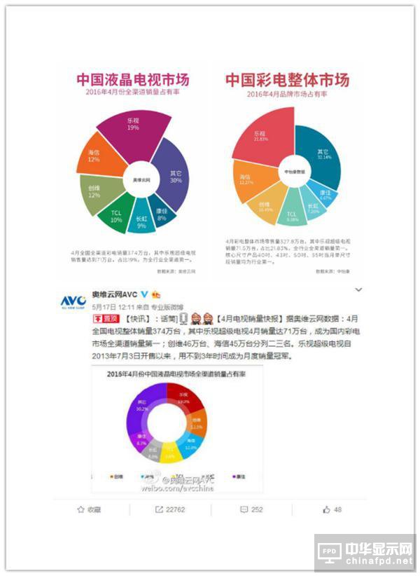 據(jù)媒體報道,奧維云網(wǎng)17日發(fā)布4月電視銷量快報,數(shù)據(jù)顯示,今年4月全國電視整體銷量374萬臺,其中樂視超級電視4月銷量達71萬臺,占19%,成為全行業(yè)全渠道銷量第一。創(chuàng)維46萬臺、海信45萬臺分列二三名。樂視超級電視自2013年7月3日開售以來,用不到3年時間成為月度絕對銷量冠軍。之后,中怡康也發(fā)布《2016年4月中國彩電整體市場品牌占有率》報告,雖然數(shù)字同奧維云網(wǎng)發(fā)布的報告有微小出入,也引起了相關競品的第一之爭,但最后依舊證實樂視超級電視4月總銷量位列全行業(yè)、全渠道第一。