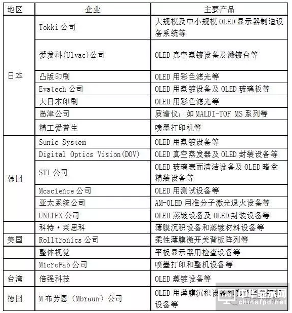 就OLED設備制造商而言,主要包括:有機蒸鍍和封裝等無源有機發光顯示(PM-OLED)用關鍵設備,濺鍍臺、等離子體增強化學氣相沉積(PECVD)系統、真空熱蒸發系統(VTE)等AM-OLED用薄膜晶體管(TFT)薄膜沉積設備,涂膠機、曝光機、干濕法刻蝕機等AM-OLED用TFT圖形制作設備,退火爐、退火氣體管道、激光退火設備等AM-OLED用TFT退火設備,TFT電學測試設備、OLED光學測試設備等AM-OLED用檢測設備,激光修補機等AM-OLED用缺陷檢測修補設備等。目前,全球主要的設備商集中在韓日兩國,如圖所示。