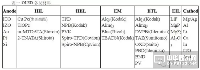OLED多層結構如圖一所示,可包括陽極(Anode)、空穴注入層(HIL)、空穴傳輸層(HTL)、有機發光層(EL)、電子傳輸層(ETL)、電子注入層(EIL)、及陰極(Cathode),在設計上究竟選用多少層材料,須視各層材料能階分布狀況而定。采用多層結構的目的是為了造成如階梯形式的能階狀態,如圖二所示,使分別從陽極和陰極所提供的空穴和電子,更容易傳輸至發光層結合而后放出光子。而在材料的使用上,會適量加入Dopant來調節所需的能階狀態。各層材料及Dopant,請參閱表一及表二。