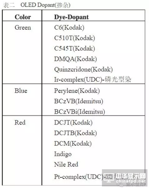 主要有:香豆素染料Coumarin6(Kodak公司第一個采用),奎丫啶酮(quinacridone,( Z$d$ QA)(先鋒公司專利),六苯并苯(Coronene),苯胺類(naphthalimide).