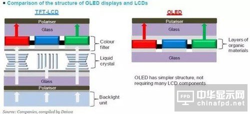 首先,先談談AMOLED與TFT-LCD的發(fā)光原理。請看下圖: