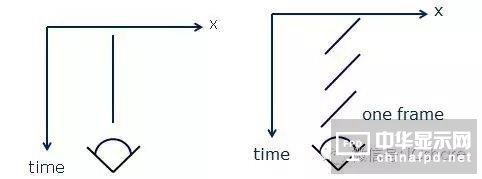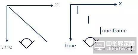 我們可以看到,左邊這張圖是真實的世界中,一個物體從左往右移動時眼睛看到的情況:隨著時間的推移,物體的軌跡是一條線;而右邊的圖則是任何一種顯示器顯示出來的情況:物體的圖像在每一個點顯示一段時間之后,就跳到下一個點;它并非是連續(xù)的運動。