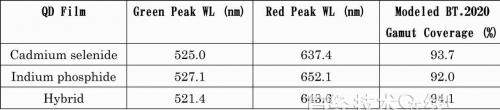 表1:量子點(diǎn)薄膜的種類和BT.2020的覆蓋率