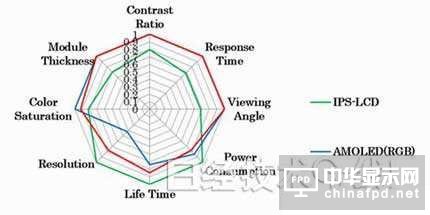 TFT液晶方面,IPS方式已成為移動(dòng)產(chǎn)品用顯示屏的事實(shí)標(biāo)準(zhǔn),而且也得到大屏幕電視機(jī)廣泛采用。比較的光學(xué)特性包括對(duì)比度、響應(yīng)時(shí)間、視角、耗電量、壽命、分辨率、色彩表現(xiàn)范圍及模塊厚度。有機(jī)EL的優(yōu)點(diǎn)是薄、高對(duì)比度、高速響應(yīng)及大視角。不過,壽命和耗電量在實(shí)用化方面存在巨大課題。通過應(yīng)用彩色濾光片,雖然解決了掩模蒸鍍的色彩分涂課題,但耗電量增加。