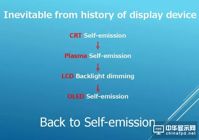 “CRT陰極射線管、等離子都是自發光,其中CRT陰極射線管具有反應非常快、沒有視角的問題、黑暗對比度比較高、顏色再現性比較好、脈沖響應非常靈敏等特點,但缺點是只適合模擬視頻;而等離子也具有反應速度快、沒有視角問題、黑暗對比度高等特點,缺點是會留下綠色熒光體殘影,動作視頻會有重影,成本也是非常高,因而沒有得到很好的發展。”麻倉憐士回顧顯示技術發展歷程表示:“盡管LCD解決了CRT陰極射線管和等離子技術存在的缺點,但是它自身仍然存在一些無法克服的問題。理想的顯示器是什么呢?它應該是結合了陰極射線管、等離子、LCD液晶所有的優點,但是同時又沒有它們的缺點。這是什么呢?這就是OLED。”