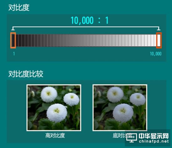亮度及對比度對于顯示屏幕的畫質來說是至關重要的部分。隨著畫面亮度的提升,顯示屏幕會呈現出更加清晰的影像;而對比度的變化,可使亮處更亮、暗處更暗、從而達到明暗分明的理想效果,顯示屏幕可呈現出更加豐富的色彩。對比度高低可以通過最亮處(白色)和最暗處(黑色)之間的部分能夠分成多少個“階梯” 來界定。如果中間的部分分成一萬個階梯,那么對比度可表示為10000:1。