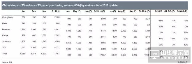 由于今年中國電視廠商有較高的出貨計劃,其戰(zhàn)略目標(biāo)是增加在海外市場的占有率,特別是海信、TCL和創(chuàng)維,因此它們在2016下半年仍然需要采購更多面板。即使它們現(xiàn)在有較高的庫存,但是由于面板供應(yīng)問題,特別是受到三星顯示計劃在今年底關(guān)閉一條負(fù)責(zé)生產(chǎn)40吋面板的七代線所帶來的影響, 和三星電子積極計劃增加三季度的面板需求,我們可以看到中國前六大電視品牌廠商將不得不積極采購面板。不過它們在四季度可能調(diào)整庫存的風(fēng)險仍然是不可忽視。
