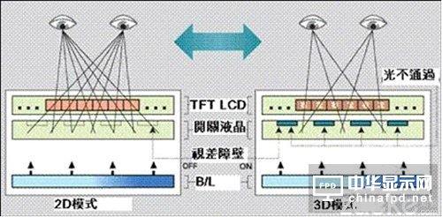 其原理和偏振式3D顯示類似,采用此種技術顯示的原理和偏振式3D顯示一樣,都是一個畫面去分割出橫豎兩個畫面來達到3D效果。光屏障式3D技術的實現方法是使用一個開關液晶屏、偏振膜和高分子液晶層,利用液晶層和偏振膜制造出一系列方向為90°的垂直條紋。由左眼看到的圖像顯示在液晶屏上時,不透明的垂直條紋會遮擋右眼;同理,應該由右眼看到的圖像顯示在液晶屏上時,不透明的垂直條紋會遮擋左眼,通過將左眼和右眼的可視畫面分開,達到顯示3D影像的目的。目前市面上采用該技術的設備是任天堂3DS。
