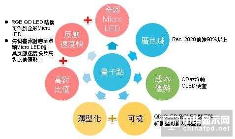量子點(QD) TV為三星在高階機種主力發展技術,主要與OLED TV相抗衡;量子點材料于顯示器中明顯優勢是可達到高色飽和度,未來三星所量產的QLED顯示器屬自發光型式,故結構更為簡單,與OLED相較,將具成本低、壽命長等優勢。至于業界高度關注的Micro LED,DIGITIMES Research認為若搭配量子點材料,則較其它結構及制程有機會達全彩化,然量產時程仍尚未確定。