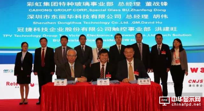會上,中國電子彩虹集團特種玻璃事業部總經理董戰鋒分別與深圳市東麗華科技有限公司總經理胡偉、冠捷科技企業股份有限公司觸控事業部協理洪建旺簽署戰略合作協議。
