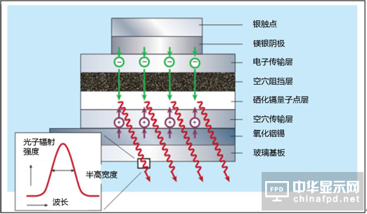 因為沒有背光源,QLED的結構原理非常簡單。其發光中心是由硒化鎘(CdSe)納米晶體組成的量子點,量子點層夾在電子傳輸和空穴傳輸有機材料層之間,外加電場使電子和空穴移動到量子點層中,它們在這里被捕獲到量子點層并且重組,從而發射光子。