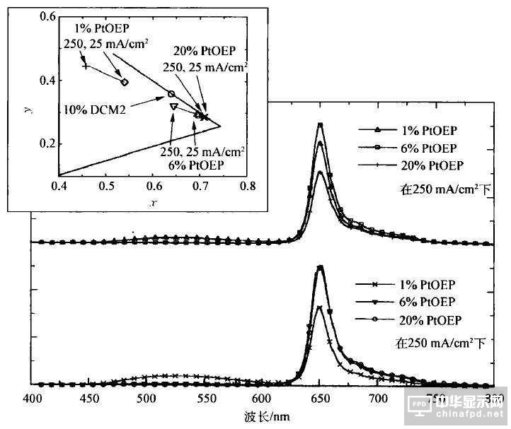 這些在光譜物理上的數據都指向在650 nm PtOEP的發光是磷光而不是熒光。PtOEP在溶液狀態下室溫的磷光卿約0. 45。