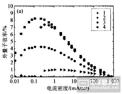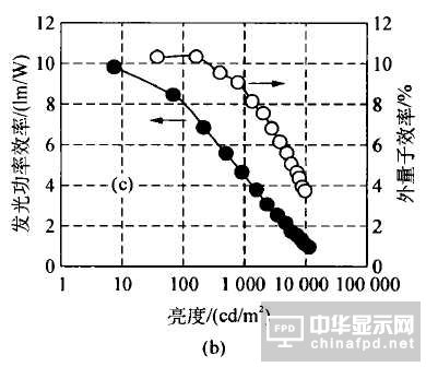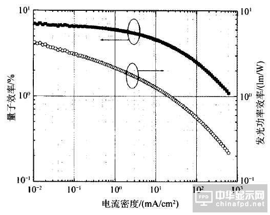 當摻雜物質量分數是21%器件最高達180o<r}p最高25 lm="" w)。很難得的是此器件只有輕微的“效率滾降”現象,在1000="" cd="" m2照明亮度下?ext="" 幾乎沒有改變,?p只略微下降至22="" w(見圖4一25)。即使到10000="" mz的超高照明亮度(電流密度不到10="" ma="" cm2),}p仍有15="" w。