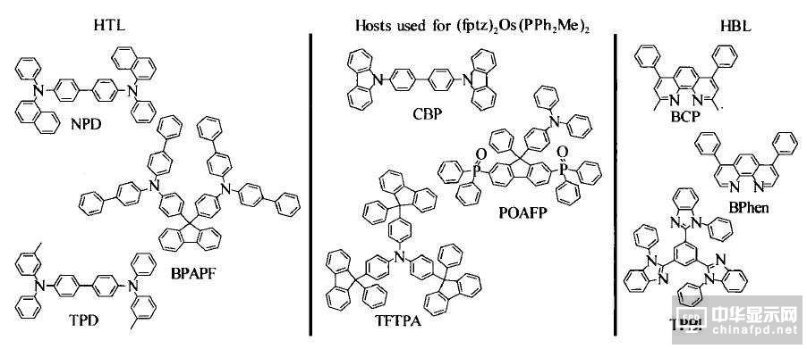 為了驗證制作紅色磷光OLED主體材料與空穴傳輸層(HTL)的重要性,以(fppz)2 Os( PPhMe2)2和(fptz)2 Os( PPh2Me)2,這兩種含Os重金屬的摻雜材料制作成OLEDs并被多次報道過,以最突出的后者來作說明:ITO/HTL/Host:( fptz)2Os( PPh2 Me)2 /HBL/LiF/Al,其發光功率效率屢創新高。