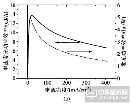 當電流密度增大(或OLED亮度增加)時器件效率迅速下降,此現象俗稱為“效率滾降”( efficiency roll off )。