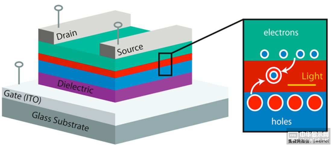 由于研究人員所設計的OLET在復合層使用特定的主客矩陣系統,因而可在大約626nm的可見光譜范圍發光。 在實驗中,研究人員分別為閘極電介質與相對電容率(PMMA),以450nm厚的高k聚合物制造OLED。