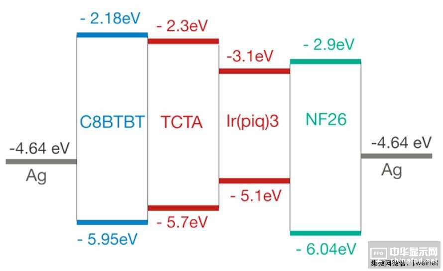 整個異質結構的能級圖。 電介層可能是PMMA (參考聚合物平臺)或高k聚合物(P(VDF-TrFE-CFE))。 其活性區域是由夾在(底部) P型與(頂部) n型有機半導體層之間的TCTA 與Ir(piq)3 (20%)混合物構成。