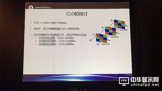 光峰研究了大多數傳統激光顯示系統,包括光峰ALPD技術和競爭對手的產品。這些產品最大的色彩劣勢呈現在兩個方面:首先是CLO(色彩亮度)亮度水平低于標稱值,這實際導致系統參數很漂亮,但在高色彩顯示的時候系統難以達到標稱亮度效果。第二,傳統激光顯示中白色畫面紅光色段能量占比只有10左右,稍高一些達到13%,這遠不能滿足高效色彩顯示中紅光能量占比的需求。