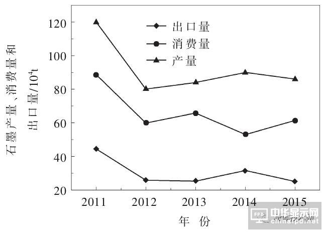 圖3 2011-2015年中國石墨產量、消費量和出口量變化趨勢