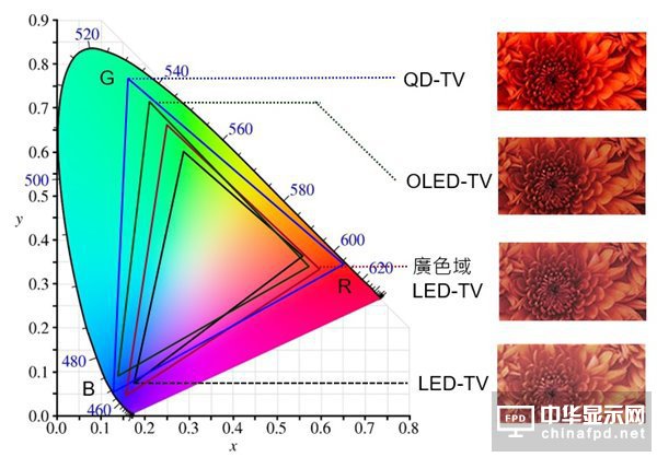 傳統以白色發光二極體(White LED,WLED)為背光源的液晶電視(LCD-TV)稱為 "LED-TV",要注意雖然廠商稱它為 LED-TV,實際上它是 " 以 LED 為背光源的 LCD-TV",它是使用 " 彩色濾光片 "(Color filter)產生 RGB 3 種顏色的光,圖中的三角形頂點就是 RGB 3 種顏色,而三角形內的顏色就是這種電視所能組合成的所有顏色(三角形愈大代表可以組合成的顏色愈多色彩愈真實),顯然并不能組合成肉眼能看到的所有顏色,但是這已經足夠制作電視讓我們看到真實的影像了;后來有廠商開發出不同白光發光二極體(LED)與彩色濾光片產生的 RGB 3 種顏色,可以組合成更多的顏色(紅色三角形),稱為 " 廣色域 LED-TV",但是這兩種電視都是使用彩色濾光片過濾白光產生 RGB 3 種顏色,而且目前工業上背光源所使用的白色發光二極體(LED)顏色受限,因此可以組合成的顏色仍然不夠多;由圖中可看出有機發光二極體電視(OLED-TV)產生的 RGB 3 種顏色可以組合成更多的顏色(綠色三角形);而量子點(QD-TV)產生的 RGB 三種顏色可以組合成更多的顏色(藍色三角形)。