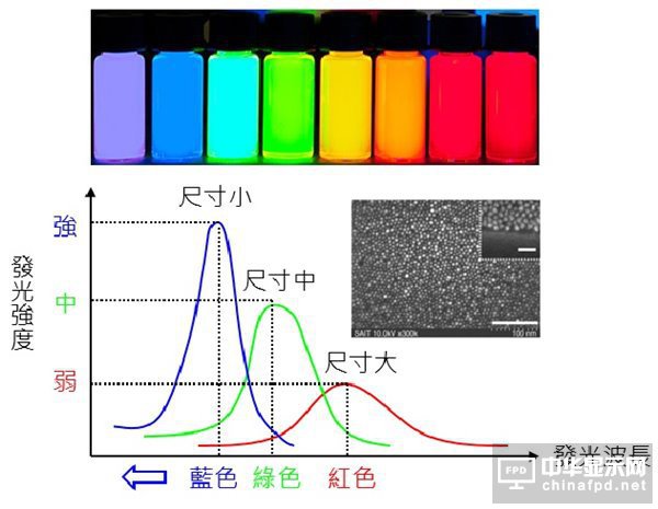 量子點電視(QD-TV)科學家發現當材料的尺寸小到 100 納米以下時會產生 " 量子局限效應 "(Quantum confinement effect),此時電子與電洞被局限在納米材料內形成自組的穩定態,造成發光性質的改變,而且納米材料的尺寸愈小時,材料發光強度愈強,發光的波長愈短(藍色),這個現象稱為 " 藍移 "(Blue shift),如圖四所示,不同顏色的光波長不同,所以光的波長就是顏色,在可見光中紅光的波長最長,綠光次之,藍光最短,換句話說,當納米材料的尺寸大,發光強度較弱,顏色為紅光(波長最長);當納米材料的尺寸變小,發光強度變強,顏色為綠光(波長次之);當納米材料的尺寸更小,發光強度更強,顏色為藍光(波長最短)。