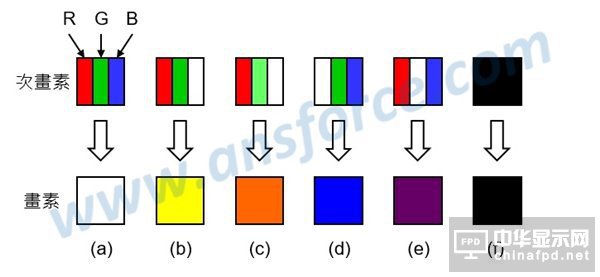 光的三原色在了解顯示原理前,我們先來理解一下各式顯示技術中彩色是如何達成的,他們均是以紅(Red,R)、綠(Green,G)、藍(Blue,B)3 種顏色 " 不同亮度 " 即可組合成連續光譜中幾乎所有可見光的顏色,因此我們稱紅、綠、藍三色為 " 光的三原色 "。如圖一所示,假設有一個方格用來顯示某一種顏色,這樣的方格稱為 " 像素 "(pixel),將這個方格垂直切割成三個小方格,分別代表 RGB 3 種顏色,這樣的小方格稱為 " 次像素 "(Sub-pixel)。