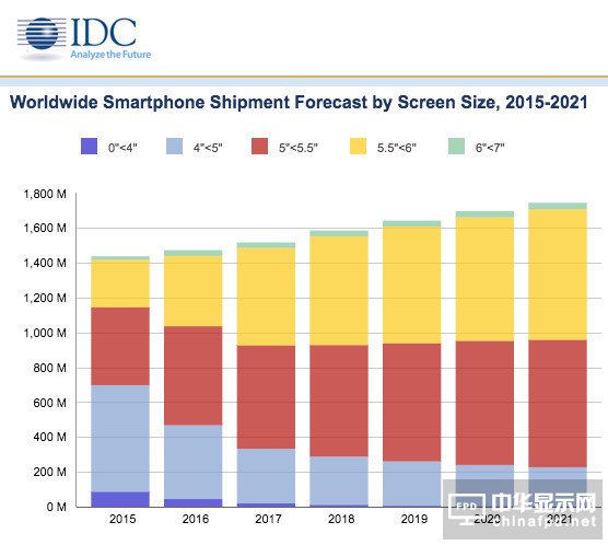 IDC預(yù)計(jì),絕大多數(shù)智能手機(jī)市場(chǎng),將由5-5.5英寸(不含)和5.5-6英寸(不含)機(jī)型“平分天下”,它們的出貨量將由今年的5.933億部和5.587億部,分別增長(zhǎng)至2021年的7.314億部和7.493億部。