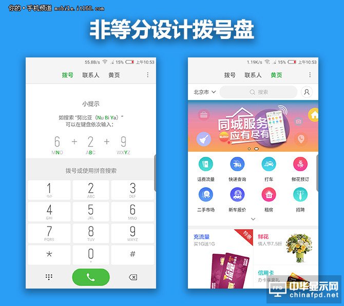 再說一個比較有意思的設(shè)計,撥號盤。努比亞Z17的屏幕尺寸為5.5英寸,但由于采用了無邊框的設(shè)計,機身寬度已經(jīng)是做得比較窄的了。但為了進一步提高單手操作的體驗,nubia UI 5.0做了很多針對性的優(yōu)化。撥號盤就是其中的一個。它撥號盤的數(shù)字按鍵區(qū)域采用非等分設(shè)計,無論左手或者右手在單手撥號的情況下,都方便按到。同時也提供有智能號碼檢索,本地號碼、各種服務(wù)號碼都可搜到,單手就能輕松搞定,這種體驗在5.5英寸的手機中并不多見。