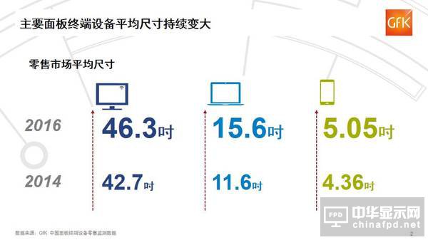 GfK數(shù)據(jù)顯示,截止2016年,中國(guó)電視、IT產(chǎn)品和智能手機(jī)的平均尺寸持續(xù)增長(zhǎng),其中IT產(chǎn)品平均尺寸提升最快,兩年內(nèi)提升了4吋至15.6吋,電視機(jī)平均尺寸則最大達(dá)46.3吋,手機(jī)平均尺寸亦突破了5吋。
