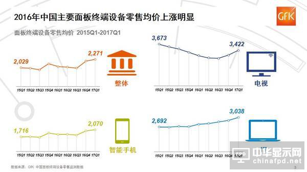 伴隨中國(guó)消費(fèi)升級(jí)和上游原材料的價(jià)格的上漲,零售市場(chǎng)正逐步向中高端方向發(fā)展。GfK中國(guó)面板終端設(shè)備零售監(jiān)測(cè)數(shù)據(jù)顯示,截止至2017年第1季度,主要面板終端設(shè)備的零售均價(jià)皆有不同程度的上漲。