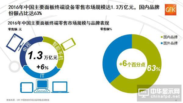 GfK數(shù)據(jù)顯示,截止至2016年,中國(guó)主要面板終端設(shè)備的零售規(guī)模達(dá)1.3萬(wàn)億人民幣,同比增長(zhǎng)6%.