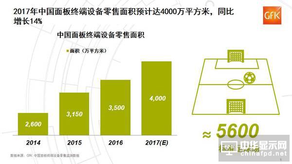 GfK數(shù)據(jù)顯示,2016年中國(guó)面板終端設(shè)備零售面積達(dá)3500萬(wàn)平方米,隨著上游產(chǎn)能的逐步增加以及零售市場(chǎng)平均尺寸的不斷提升,預(yù)計(jì)2017年零售面積有望突破4000萬(wàn)平方米,同比增長(zhǎng)14%,相當(dāng)于5600個(gè)標(biāo)準(zhǔn)足球場(chǎng)大小。