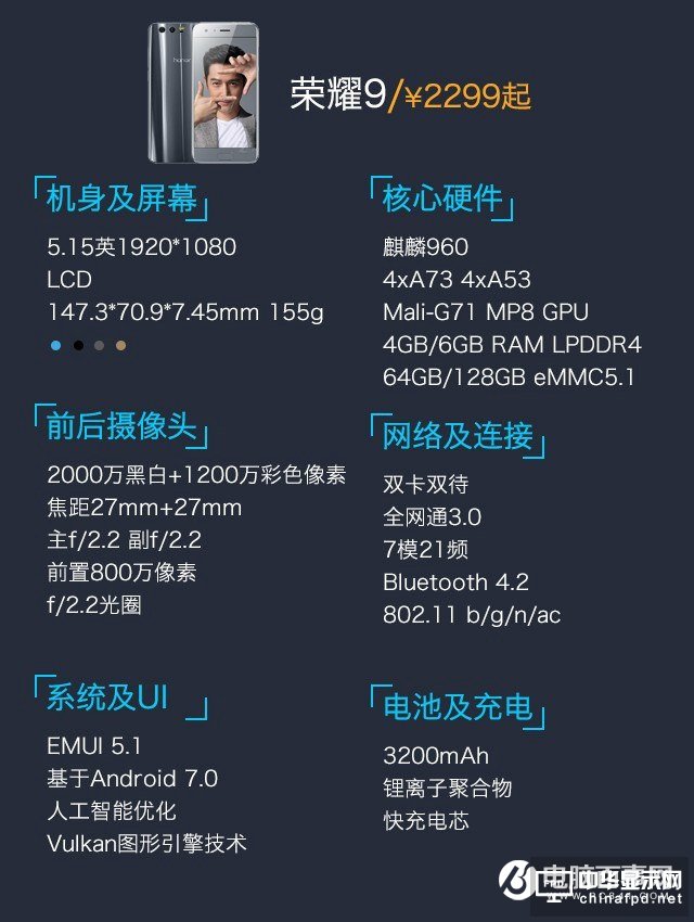 先來看參數部分,榮耀9主打小屏,售價2299元起,相比小米6、一加5、努比亞Z17、OPPO R9等熱門旗艦機價格更便宜一些,在今年的國產旗艦機中,價格屬于相對比較親民的了。