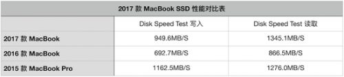 而在 WWDC 上蘋果著重強調了新 Mac 產品線在 SSD 上的性能提升,與 MacBook Pro 只有高端機型得到優化不同,本次主流配置的 MacBook 也享受到了新 SSD 的好處(當然也是因為之前老款 MacBook 的 SSD 太慢了),寫入性能提升了大約 37%,讀取性能提升了大約 55%,但與 2015 款 MacBook Pro 的 SSD 性能差距還是比較明顯。