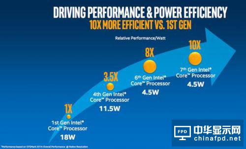 在核心架構、制程和主板接口上,7 代“Kaby Lake”和 6 代“Skylake”保持完全一致,但 Intel 表示在工藝上還是有了優化,采用了更高的鰭片與更寬的柵極間距,這有助于降低 CPU 的內核能耗,使得這代 CPU 很容易提升頻率。根據 Intel 的數據,7 代酷睿相比 6 代,同樣能耗下的性能提升了 12%。