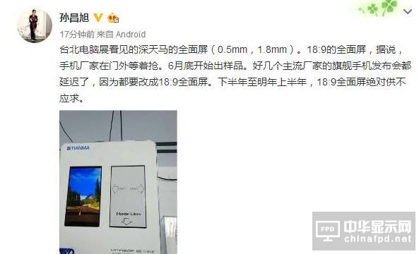 6月8日,天馬在臺(tái)北電腦展上展示了一款18:9的全面屏,其左右邊框只有0.5mm,下邊框只有1.8mm。