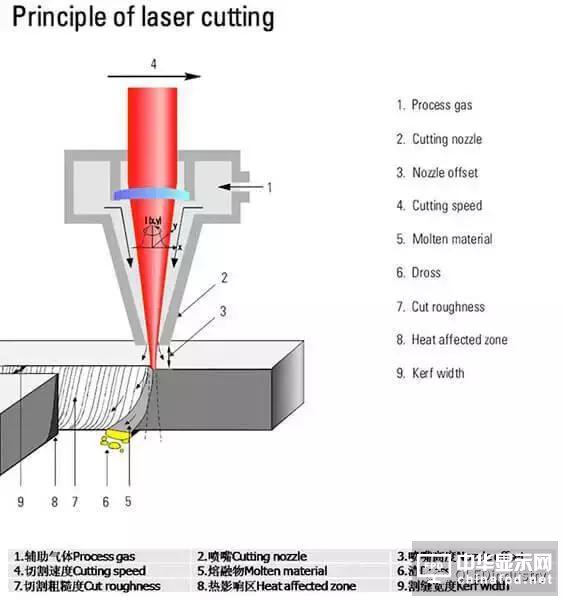 激光切割的原理是將激光聚焦到材料上,對材料進行局部加熱直至超過熔點,然后用高壓氣體將熔融的金屬吹離,隨著光束與材料的移動,形成寬度非常窄的切縫,激光切割的精度可以達到20um。