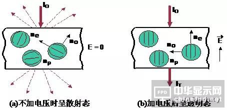 在外加電場驅(qū)動(dòng)下,液晶分子和二色性染料分子的排列取向與電場方向一致,從而表現(xiàn)出明(彩色)/暗對(duì)比的顯示效果