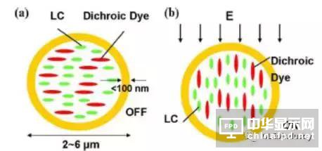 芯材內(nèi)液晶分子受二色性染料的影響而呈現(xiàn)特定的排列;
