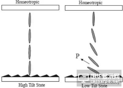 受表面錨泊作用的影響,液晶分子在槽柵橫截面上的取向存在著高、低傾角兩個(gè)穩(wěn)定狀態(tài),該穩(wěn)態(tài)效果是槽柵深度和槽距比例的函數(shù),兩種穩(wěn)態(tài)效果之間的轉(zhuǎn)變可以通過外加電場的調(diào)節(jié)來實(shí)現(xiàn)。