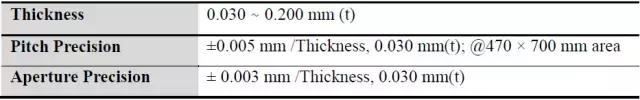 多重材料復合法主要采用樹脂和金屬材料混合以制作FMM以應對熱膨脹,V-Technology目前具有做到厚度為5um,且成膜精度位置為2um FMM的能力(向1 um發展)(1)。