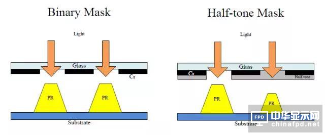 在使用時Cr 面與PR 膠接觸進行曝光。Photomask 可以進一步被分為Binary Mask 和Half-tone Mask(3):