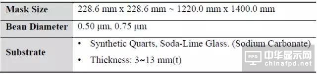 Display 產線上使用的Mask 為兩種:Array 段和CF 段 (TFT-LCD)用的、以石英玻璃為基礎材料的曝光Photomask; 和AMOLED 段以金屬為基本材料的Mask (Open Mask & FMM)。