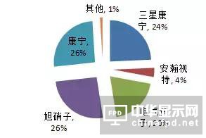 隨著顯示屏生產行業是技術密集型和資本密集型企業, 存在較高的技術門檻, 如制造工藝復雜與核心技術制備少數國家掌握。截至至2016年, 全球主要的玻璃基板供應商為美國的康寧、日本的旭硝子和日本的電氣硝子等。主要的玻璃基板供應商的市場份額如Fig 2 所示。對于玻璃基板的制造, 國產化率不足20%(Fig 1)。