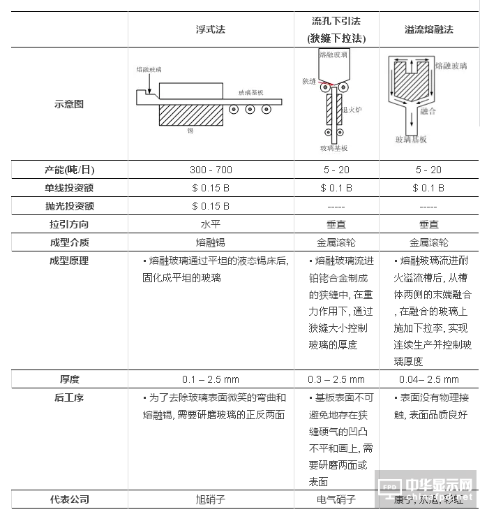 現在玻璃的生產方式主要為3種, 浮法、狹縫下拉法和溢流熔融法。三種方法的產能和工藝如Table 6 所示。